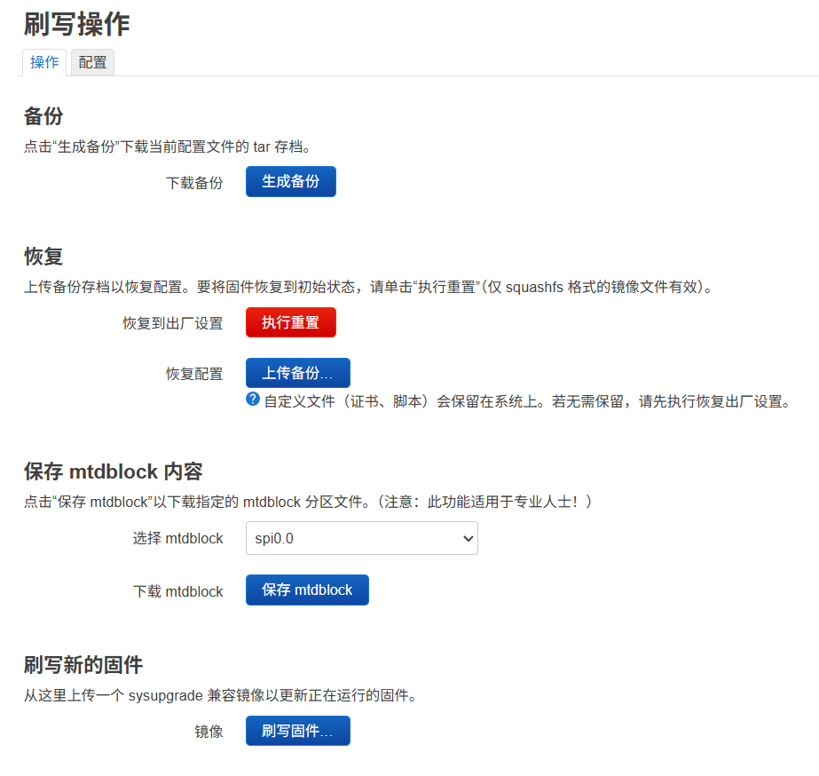 PS:其实这一步是直接可以在网页内重置的,路径通常是 系统 -> 备份和升级 -> 恢复出厂设置 。可惜我当时以为这个重置按钮指的是 “上传自己的备份文件然后点这个按钮恢复备份”,从而走上了一条不归路。