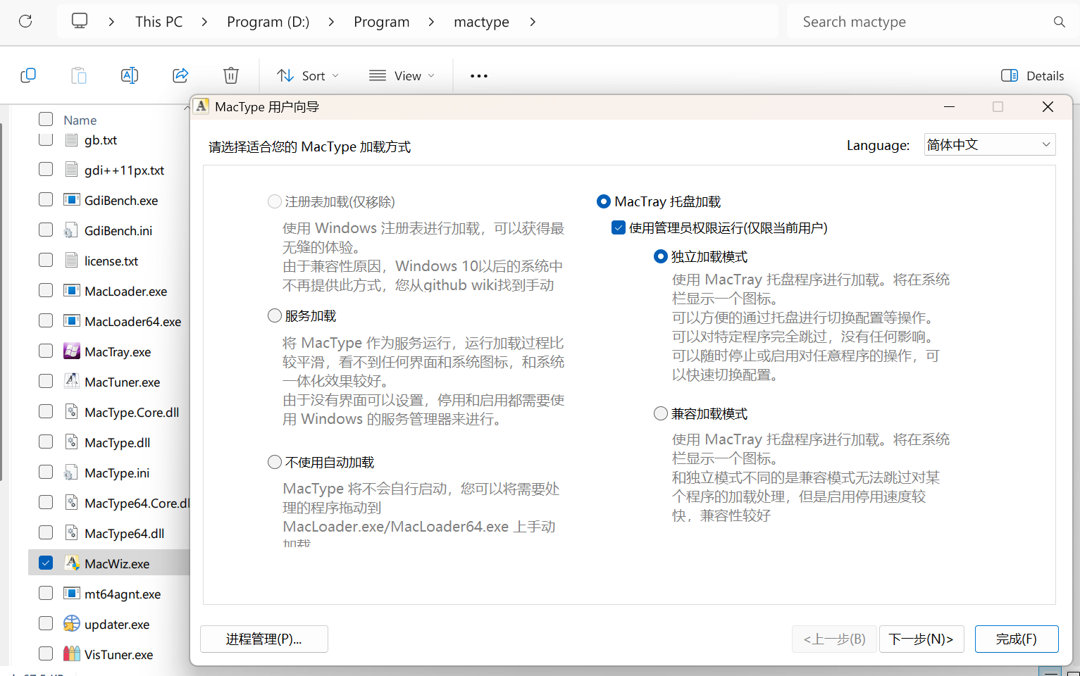 解决方法找到你安装 mactype 的目录然后进行配置,打开文件名为 MacWiz.exe 的程序,推荐选择后台进程注入的方式。如图: