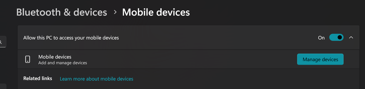 - 进入 Windows 设置 > 蓝牙和其他设备 > 移动设备,启用 “Allow this PC to access your mobile devices”。