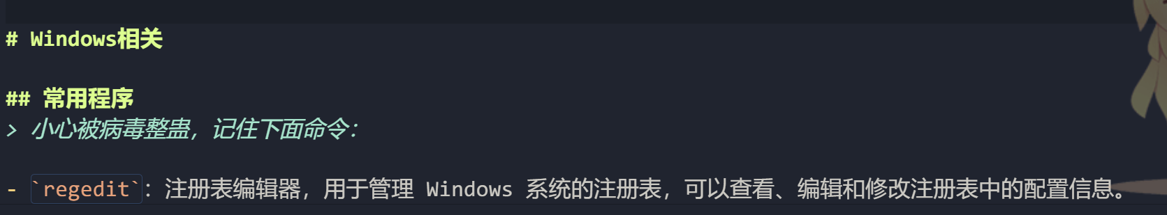 # Windows 相关 # 常用程序 小心被病毒整蛊,记住下面命令: regedit :注册表编辑器,用于管理 Windows 系统的注册表,可...